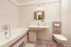 В просторных помещениях можно оформить поверхности, используя как смелые и несколько провокационные краски, так и контрастные решения. В интерьере ванной из плитки неплохо смотрятся цветовые сочетания белой сантехники с интенсивно красными, бордовыми, зелеными, оранжевыми, синими или янтарно-желтыми стенами.