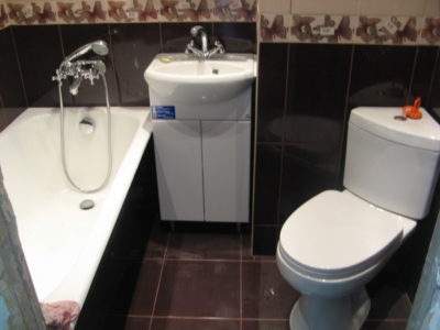 Мы установили унитаз, акриловую ванну с гибким душем, рукомойник со шкафом и зеркалом, а также смонтировали держатели для туалетной бумаги и полотенец. Проведена новая электропроводка и выполнен монтаж электрического полотенцесушителя. Подвесной потолок оформлен пластиковыми панелями со встроенными светильниками. Смета ремонта — 108000 р. Черновые материалы — 36 тыс. руб.