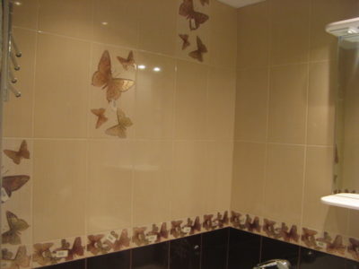 Наша компания выполнила ремонт санузла на Рязанском проспекте. Изюминкой интерьера стало оформление дизайна неординарным орнаментом. Декоративные плитки и фреза с изображением золотых бабочек перемежаются с однотонным кафелем бежевого и темно-коричневого цветов. За счет контраста удалось визуально расширить пространство.