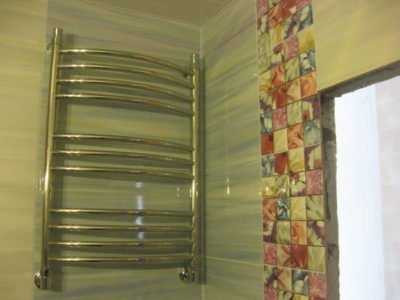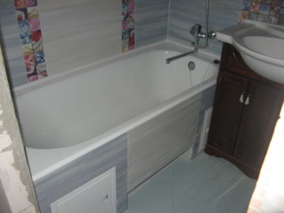 Главными достоинствами дизайна ремонта совмещенного санузла ванной на Сумском проезде стали белоснежные полы, тумба под рукомойник с темно-коричневыми фасадами и декорирование стен флористическими узорами. Изысканности интерьеру придают мозаика вдоль поверхностей и боковые светильники, выполненные в старинном стиле. В небольшом помещении мы установили новую ванну с гибким душем, умывальник со шкафчиком, унитаз, полотенцесушитель и сушилку для белья. Смета на ремонт составила 98 тысяч рублей. На закупку черновых материалов ушло 29 тыс. руб.