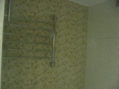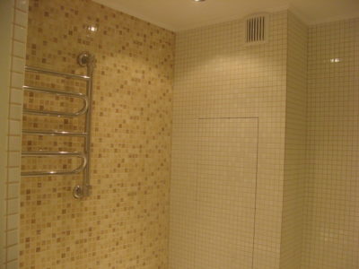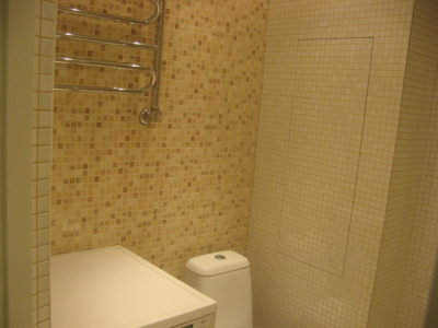 Наша компания выполнила капитальный ремонт совмещенного с ванной комнатой санузла на улице Новочеремушкинская. Для декорирования поверхностей дизайнер выбрала мозаичную плитку двух видов: однотонную и цветную. Благодаря правильно подобранному расположению сантехники малогабаритное помещение выглядит просторным, а за счет теплых оттенков плитки – уютным. В санузле мастера установили полукруглую душевую кабину со стеклянными дверцами и рукомойник с тумбой с правой стороны от входа, а компактный унитаз, полотенцесушитель и стиральную машину – с левой. В подвесной потолок вмонтированы точечные светильники, а на пол уложен кафель светло-бежевого цвета. Цена ремонта – 126 тысячи рублей. Стоимость черновых материалов – 32 тыс. руб
