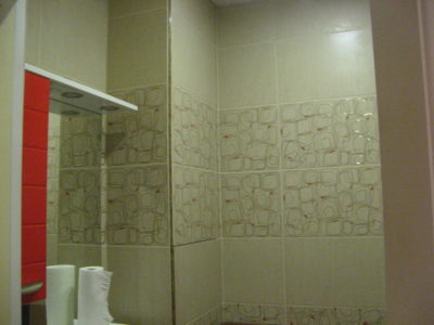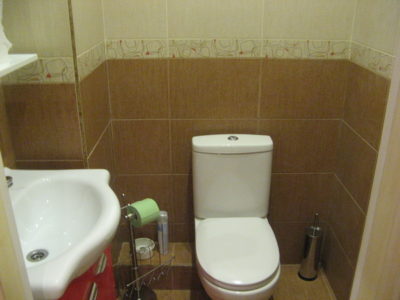 Наша компания выполнила ремонт санузла на улице Одесская. Особенности планировки позволили компактно расположить в нишах унитаз и тумбу с рукомойником и зеркалом. Модель мойдодыра укомплектована подвесными стеклянными полками со встроенными светильниками. Для оформления поверхностей мы выбрали белые и коричневые плитки с имитацией под срез дерева. Потолок выполнен из пластиковых панелей. Стоимость бюджетного ремонта составила 28600 руб. Стоимость черновых материалов — 8000 р.