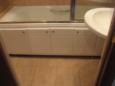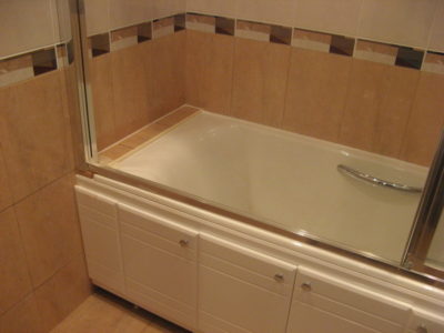 Мы выполнили ремонт ванной комнаты и туалета на большой Черемушкинской в едином стилевом решении. Для отделки стен и пола использовались керамические плиты нежных оттенков (розовый и бежевый). По центру боковых поверхностей уложена декоративная фреза. В туалете установлен унитаз, а инженерные коммуникации скрыты за защитным экраном с вертикальными жалюзи. В ванной комнате мы смонтировали ванну, укомплектованную раздвижными стеклянными шторами и умывальник модели «Тюльпан». На стену повесили большое зеркало, а полость под ванной задекорировали белыми фасадами. Цена ремонта — 122 тысячи рублей. Расходы на черновые материалы — 33 тыс. р.