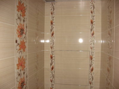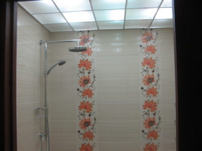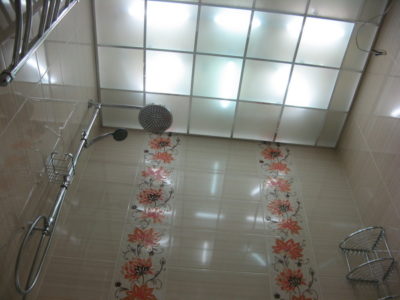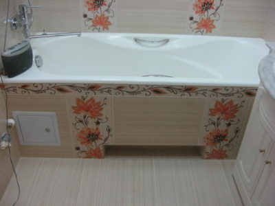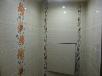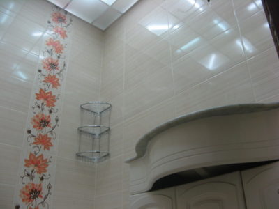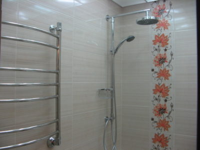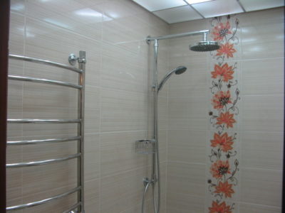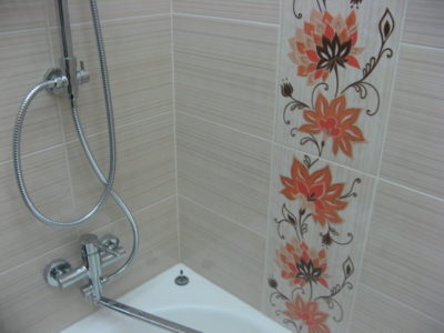 Наша компания выполнила ремонт ванной комнаты и туалета на улице Гарибальди. Для облицовки стен и оформления пола мы выбрали кафель кремового цвета. Разбавить скучный интерьер удалось за счет отделки боковых поверхностей и экрана под ванной декоративным узором из керамической плитки с роскошным цветочным рисунком. В ванной комнате установлены полотенцесушитель, мойдодыр и ванна с гибким душем. На потолке смонтирована подвесная конструкция из металлического профиля и стеклянных панелей. В туалете установлен новый унитаз, а инженерные коммуникации замаскированы под общий интерьер. Стоимость работ под ключ составила 112 тысяч рублей. Черновые материалы — 36 тыс. р.