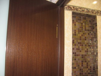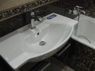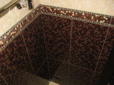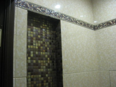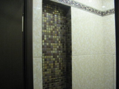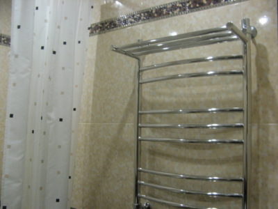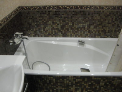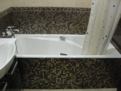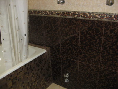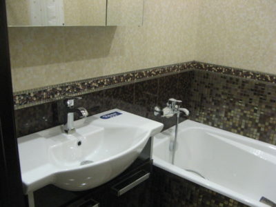 Наша компания выполнила ремонт ванной комнаты и туалета на улице Коломенская. Солидности интерьеру придают светло-бежевые и коричневые цвета, используемые при отделке поверхностей. Примечательно, что для облицовки нижней части стены и защитного экрана использовалась разноцветная мозаика. В комнате установлены ванна с гибким душем, штанга для штор, электрический полотенцесушитель и мойдодыр. В туалете смонтирован унитаз, а инженерные коммуникации замаскированы под общий интерьер. Общая смета ремонта — 125 тыс. руб. Черновые материалы — 34 тыс. р.