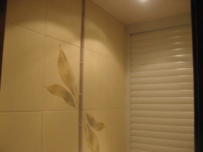 В ходе ремонта были полностью демонтированы устаревшее сантехническое оборудование и отделка с поверхностей. На стены и полы в помещениях уложена керамическая плитка оливкового цвета, а потолок выполнен из пластиковых панелей. Привнести в дизайн нотку элегантности удалось за счет укладки декоративных элементов с имитацией под бамбуковое дерево.