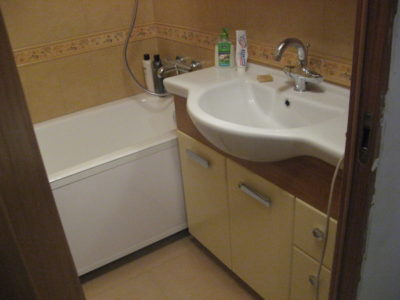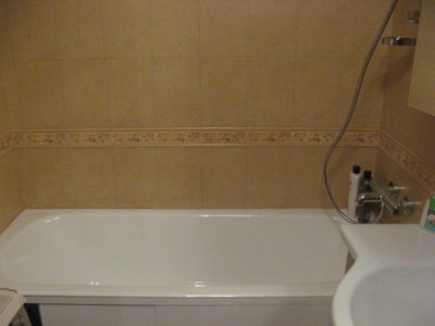 Наша компания выполнила бюджетный ремонт ванной комнаты в квартире старого жилого фонда на улице Новопесчаная. Потолок оформлен пластиковыми панелями со встроенными светильниками. Стены и полы облицованы однотонной керамической плиткой кремового цвета. Для обустройства душа в стену вмонтирована хромированная подставка. В комнате установили ванну, мойдодыр на три створки и стиральную машину. Над мойкой мы навесили зеркало по типу трюмо со складными ставнями. Стоимость ремонта составила 74 тыс. руб. На черновые материалы было затрачено 25000 р.